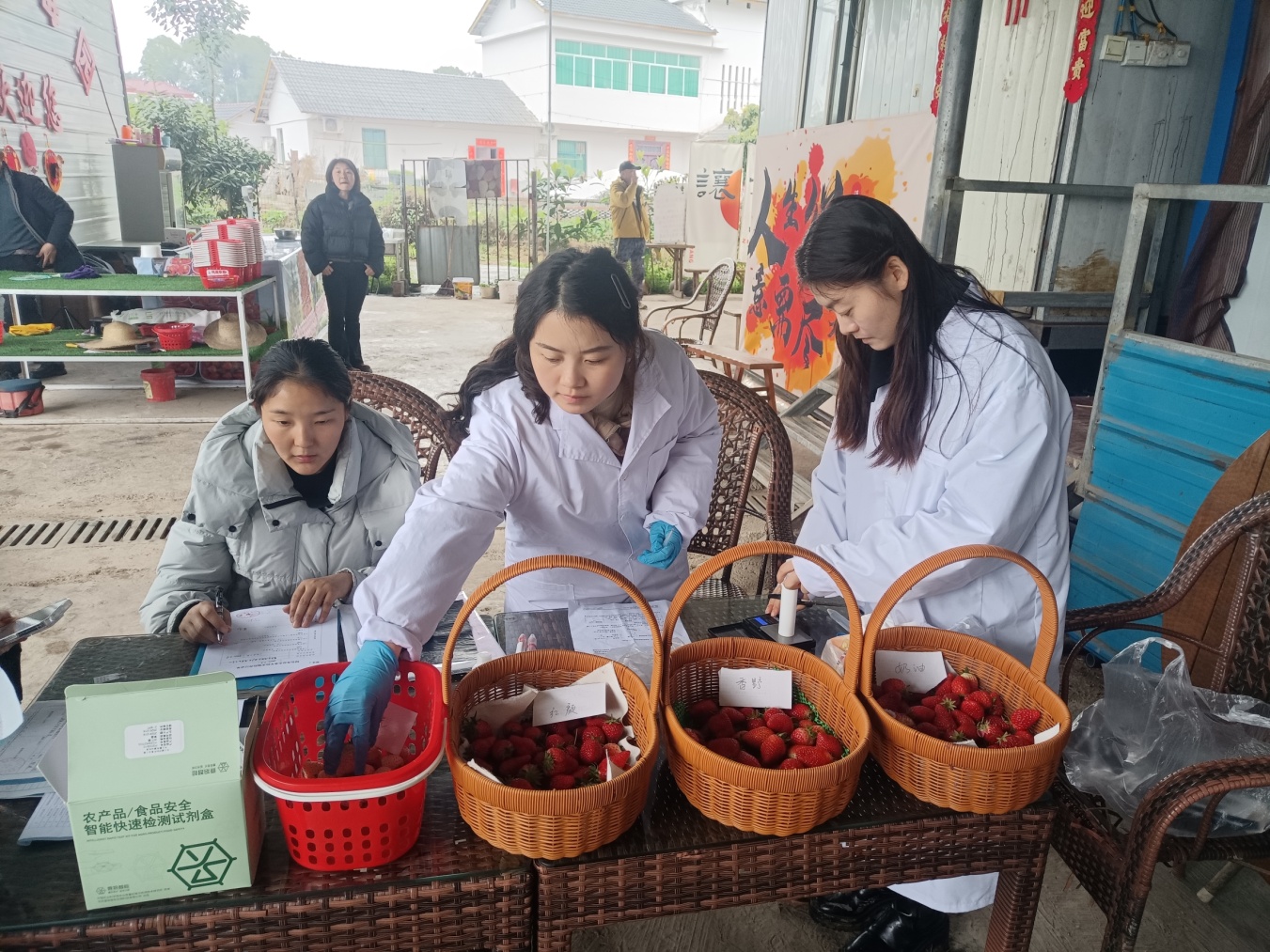 检测人员在马武镇辖区乾渝草莓种植场现场抽检草莓