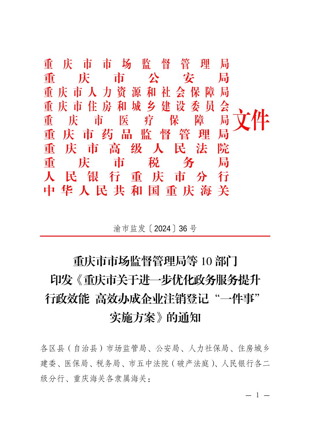 重庆市市场监督管理局等10部门印发《重庆市关于进一步优化 提升行政效能 高效办成企业注销登记“一件事” 实施方案》的通知