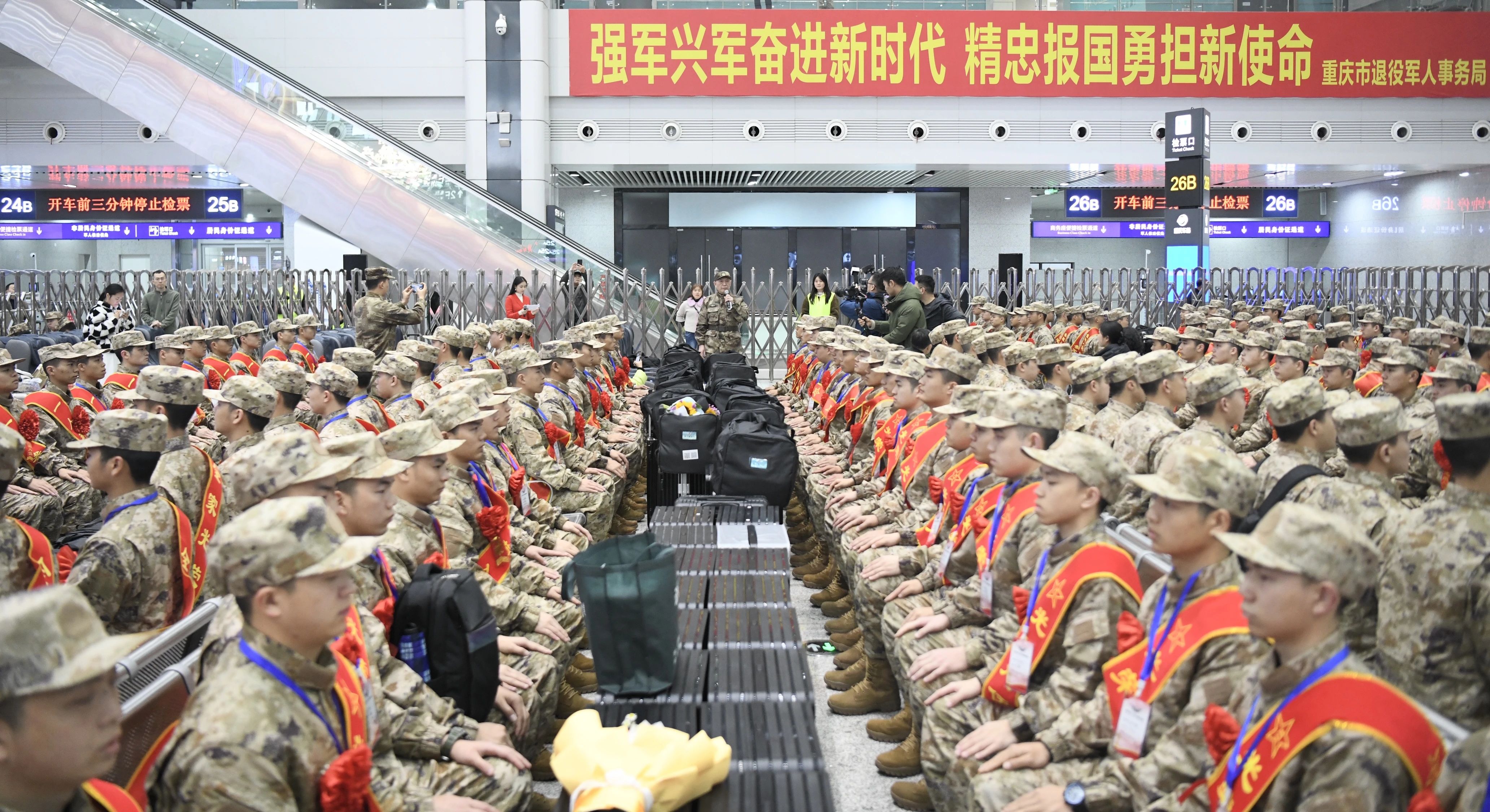 3月18日,2025年春季“功臣模范送新兵”活动在重庆火车北站举行。本次活动由市退役军人事务局主办,市军供站承办。邀请一等功臣江玉贵、二等功臣刘明星,寄语入伍新兵,勉励他们扎根军营、苦练本领、建功国防。