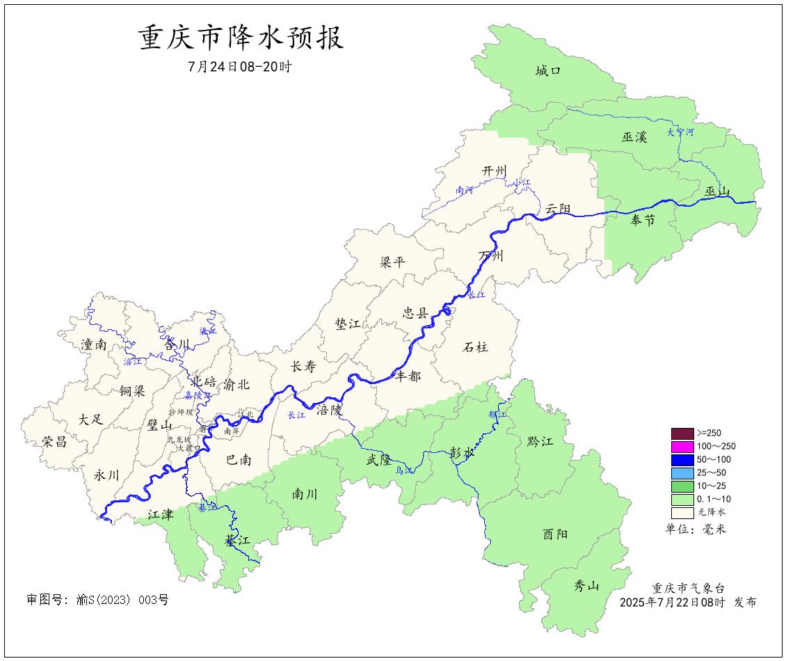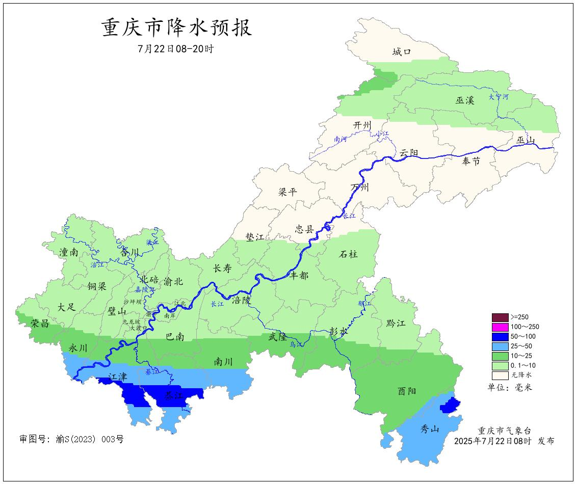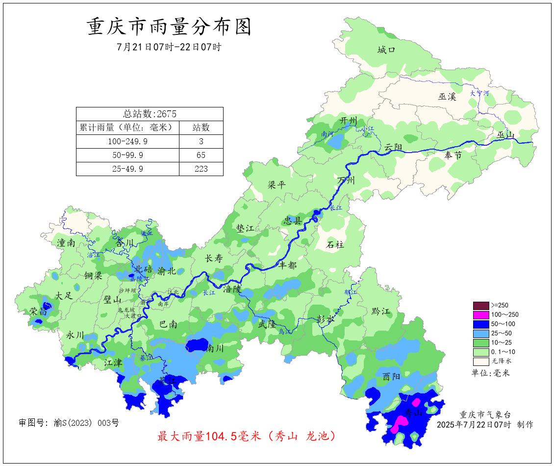 昨日天气实况显示,21日07时—22日07时,我市偏南地区大到暴雨,局地大暴雨,其余地区小到中雨。秀山的2个雨量站达大暴雨,北碚、荣昌、永川、江津、綦江、南川、忠县、酉阳、秀山等9个区县的64个雨量站达暴雨,最大雨量104.5毫米(秀山龙池),最大小时雨量52.9毫米(忠县涂井乡,21日17时)。巴南、江津、綦江、南川、垫江、忠县、开州、云阳、奉节、黔江、秀山等11个区县局地出现8级以上阵性大风,其中最大风速24.5米/秒(10级,开州南雅21日19时)。气温大部地区22~36℃,开州、云阳、巫溪等3个区县最高气温超过37℃,最高达39.5℃(巫溪)。