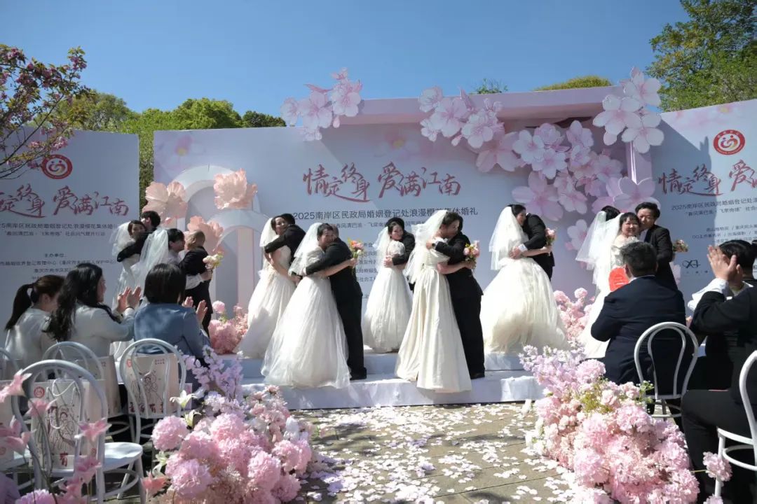 阳春三月,南山植物园樱花广场成为文明新风的实践场。在“情定终身,爱满江南”主题集体婚礼中,9对“老中青”三代夫妻携手漫步于烂漫樱花林间,在自然景观与人文设计完美融合的浪漫场景中,庄重地许下爱的誓言。