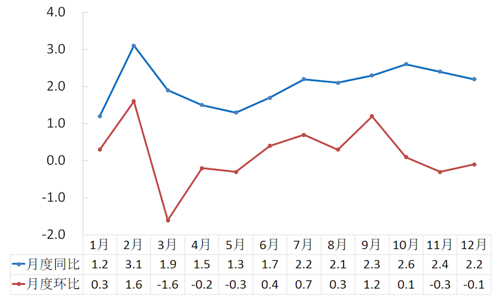 全年居民消费价格比上年上涨2.0%,其中食品价格上涨1.4%。工业生产者出厂价格上涨2.1%。工业生产者购进价格上涨2.5%。固定资产投资价格上涨5.0%。农产品生产者价格下降0.3%。
