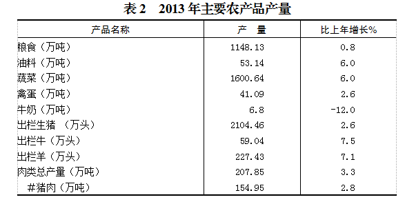全年粮食总产量1148.13万吨,比上年增长0.8%。其中,夏粮产量153.61万吨,减少0.4%;秋粮产量994.52万吨,增长1.0%。油料总产量53.14万吨,增长6.0%。蔬菜总产量1600.64万吨,增长6.0%。肉类总产量207.85万吨,增长3.3%。
