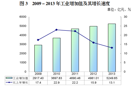 全年实现工业增加值5249.65亿元,比上年增长13.1%,占全市地区生产总值的41.5%。其中规模以上工业增加值增长13.6%。规模以上工业企业实现总产值15824.86亿元,同比增长14.5%。其中,大中型企业11288.89亿元,增长12.7%;国有控股企业4487.86亿元,增长10.8%。