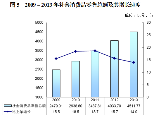 全年实现社会消费品零售总额4511.77亿元,比上年增长14.0%,扣除价格因素,实际增长12.0%。按经营地统计,城镇消费品零售额4287.05亿元,增长13.9%;乡村消费品零售额224.72亿元,增长14.8%;按行业统计,批发和零售业零售额3844.19亿元,增长14.4%;住宿和餐饮业零售额667.57亿元,增长11.2%。
