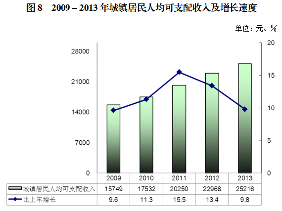 全年城镇居民人均家庭总收入26850元,比上年增长8.2%,其中人均可支配收入25216元,增长9.8%。总收入中,人均工资性收入16655元,增长8.0%;人均经营净收入2329元,增长6.7%;人均财产性收入675元,增长25.4%;人均转移性收入7191元,增长7.8%。城镇居民人均消费支出17814元,比上年增长7.5%。城镇居民恩格尔系数40.7%,比上年下降0.8个百分点。