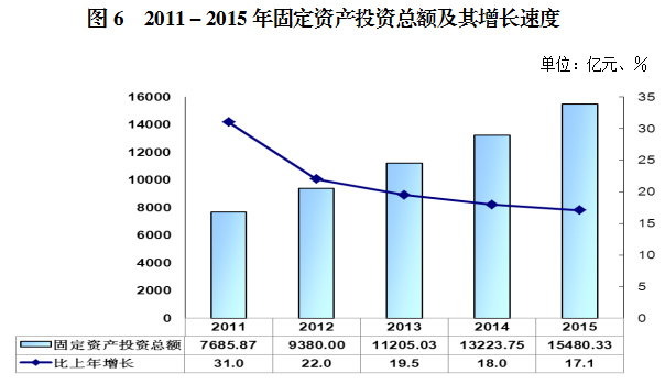 全年完成固定资产投资总额15480.33亿元,比上年增长17.1%。其中,第一产业投资533.24亿元,增长9.5%;第二产业投资4997.96亿元,增长19.9%;第三产业投资9949.12亿元,增长16.1%。