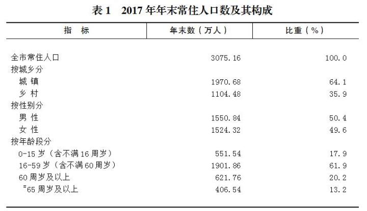 全市常住人口3075.16万人,比上年增加26.73万人,其中城镇人口1970.68万人,占常住人口比重(常住人口城镇化率)为64.08%,比上年提高1.48个百分点。全年外出市外人口482.31万人,市外外来人口167.65万人。