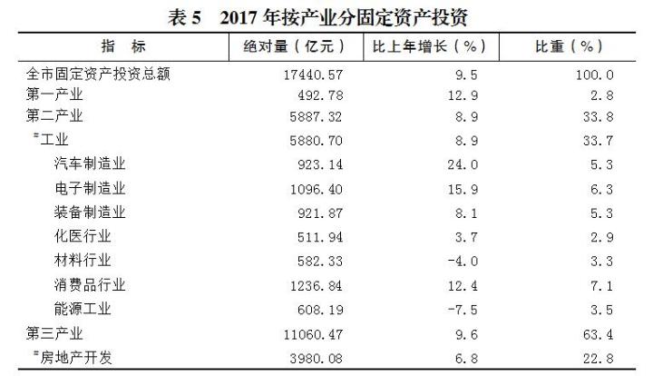 全年完成固定资产投资总额17440.57亿元,比上年增长9.5%。其中,基础设施建设投资5659.12亿元,增长15.8%,占全市固定资产投资的32.4%;民间投资9522.88亿元,增长13.5%,占全市固定资产投资的比重为54.6%。