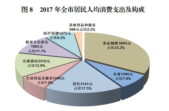全市居民人均消费支出17898元,比上年增长9.2%。按常住地分,城镇居民人均消费支出22759元,增长8.2%;农村居民人均消费支出10936元,增长9.9%。全市居民恩格尔系数为33.2%,比上年下降1.0个百分点。其中城镇为32.1%,农村为36.5%。